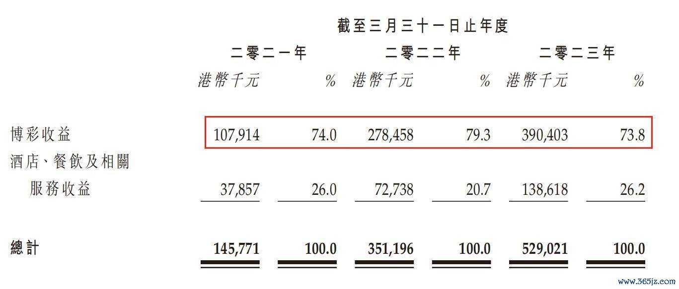 而在百乐皇宫的各项收入中,博彩收入占据着绝对的大头。2021-2023财年占比分别为74%、79.3%、73.8%,一直维持着超70%的占比。