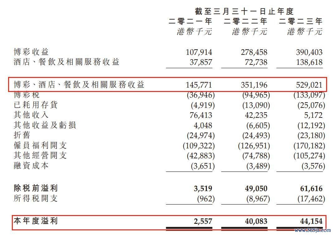招股说明书显示,2021-2023财年(财政年结日为3月31日),百乐皇宫的总营收分别为1.46亿、3.51亿和5.29亿港币,营收整体增长262%。同期净利润分别为0.03亿、0.4亿和0.44亿港币,2023财年净利率同比2022财年下滑27%。